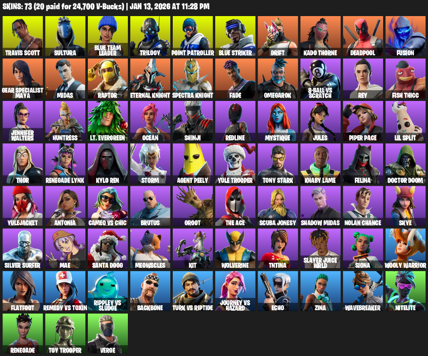 Fortnite Account ( PC ) (Travis Scott, Point Patroller, Gear Specialist Maya, Sultura, Blue Team Leader, Trilogy, Drift, Kado Thorne, Deadpool, Fusion, Midas, Raptor, Eternal Knight, Fade, Omegarok, 8-Ball vs Scratch, Rey, Fish Thicc) (73 Skins) - MessyModdingStore