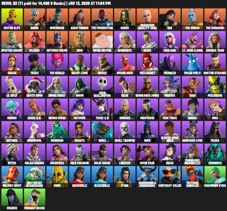 Home » Products » Fortnite Account ( PC ) (Victor Elite, Ronin, Omegarok, Kado Thorne, The Foundation, Hades, Paradigm (Reality-659), Era, Spectra Knight, Valeria, Optimus Prime, Zeus, Peter Griffin, Aphrodite, Nisha, Harlowe, Lt. John Llama, Ahsoka Tano) (82 Skins)