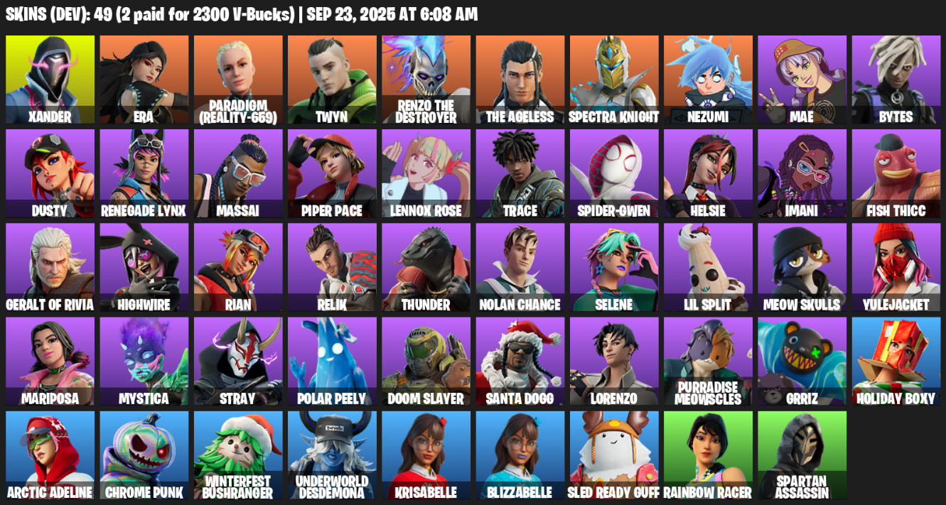 Home » Products » Fortnite Account ( PC ) (Xander, Era, Paradigm (Reality-659), Twyn, Renzo the Destroyer, Spectra Knight, Nezumi, Mae, Bytes, Dusty, Renegade Lynx, Massai, Piper Pace, Lennox Rose, Trace, Spider-Gwen, Helsie, Imani, Fish Thicc) (49 Skins)