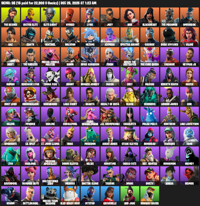Home » Products » Fortnite Account ( PLAYSTATION / PC / XBOX ) (The Reaper, Elite Agent, Lara Croft, Hybrid, Lynx, Joey, Rox, Blackheart, Omegarok, Raz, Zenith, Sentinel, Oblivion, Nezumi, Kymera, Spectra Knight, Carbide, Dark Voyager) (98 Skins)