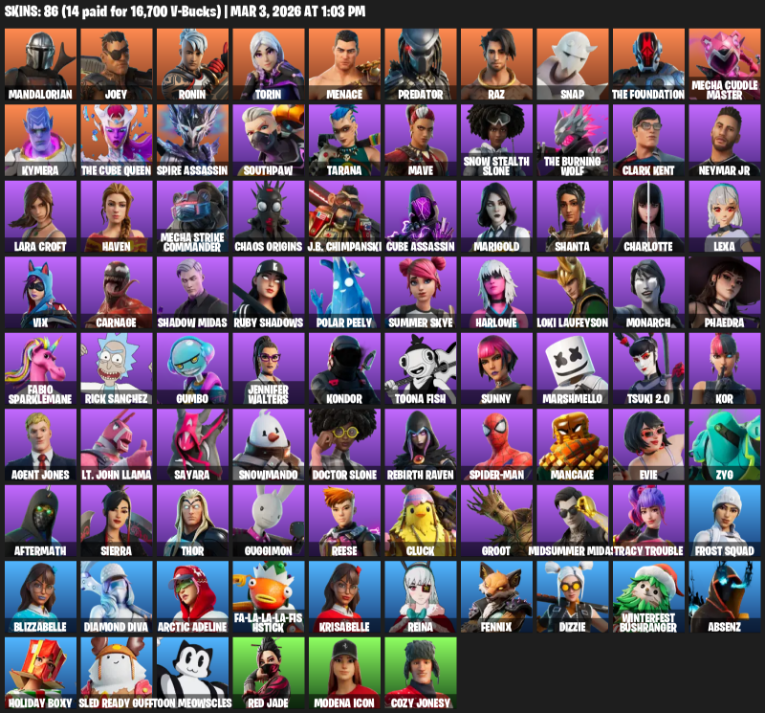Home » Products » Fortnite Account ( PLAYSTATION / XBOX ) (Lara Croft, Mandalorian, Joey, Ronin, Torin, Menace, Predator, Raz, Snap, The Foundation, Mecha Cuddle Master, Kymera, Spire Assassin, Southpaw, Tarana, Mave, Snow Stealth Slone, Clark Kent) (86 Skins)