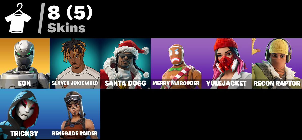 Home » Products » Fortnite Account ( PLAYSTATION / XBOX / PC / MOBILE / NINTENDO ) (Renegade Raider, Eon, Juice WRLD, Santa Dogg, Merry Marauder, Yulejacket, Recon Raptor, Tricksy) (8 Skins)