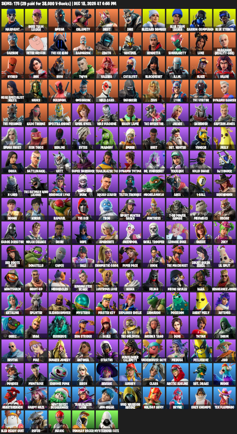 Home » Products » Fortnite Account ( PLAYSTATION / XBOX / PC ) (Omega, Gear Specialist Maya, Warpaint, Rose Team Leader, Calamity, Drift, Dire, Blizzard Bomber, Carbon Commando, Blue Striker, Carbide, Peter Griffin, The Ice King, Ragnarok, Zenith, Sentinel, Vendetta, Singularity, Luxe) (175 Skins)