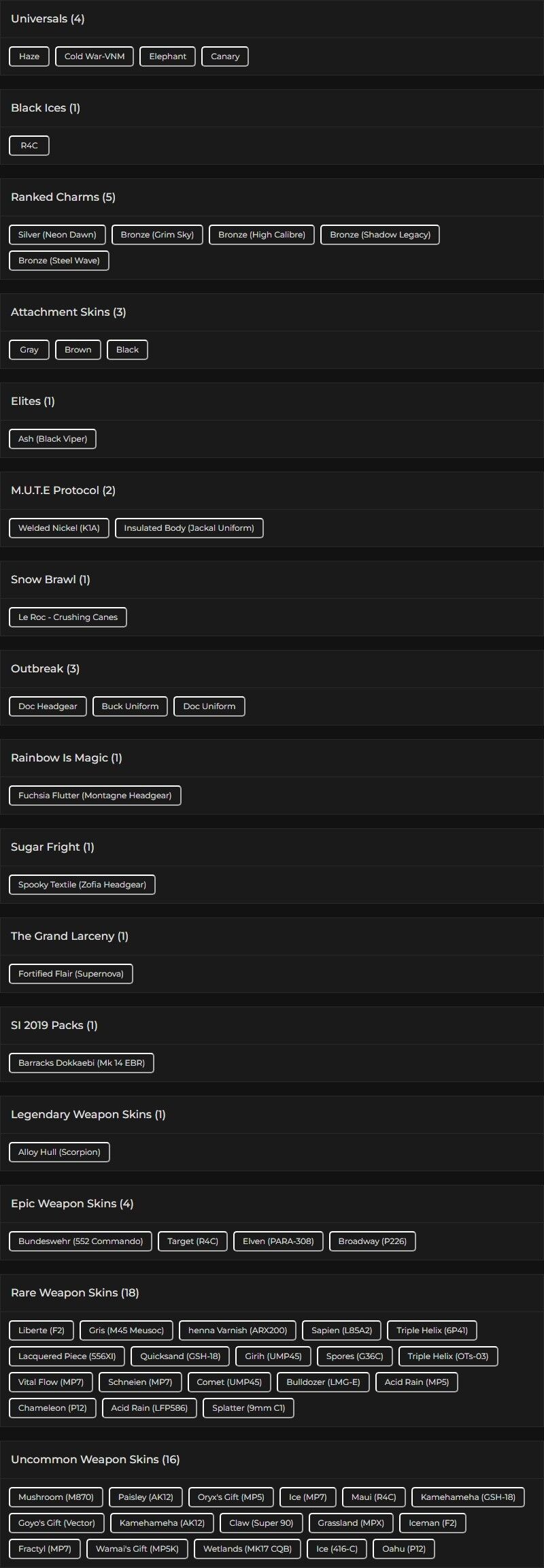 You can see all the skins and every detail from here r6skins.locker/profile/e3f52dc5-9c2d-4972-8abb-0e4fffa16e4b