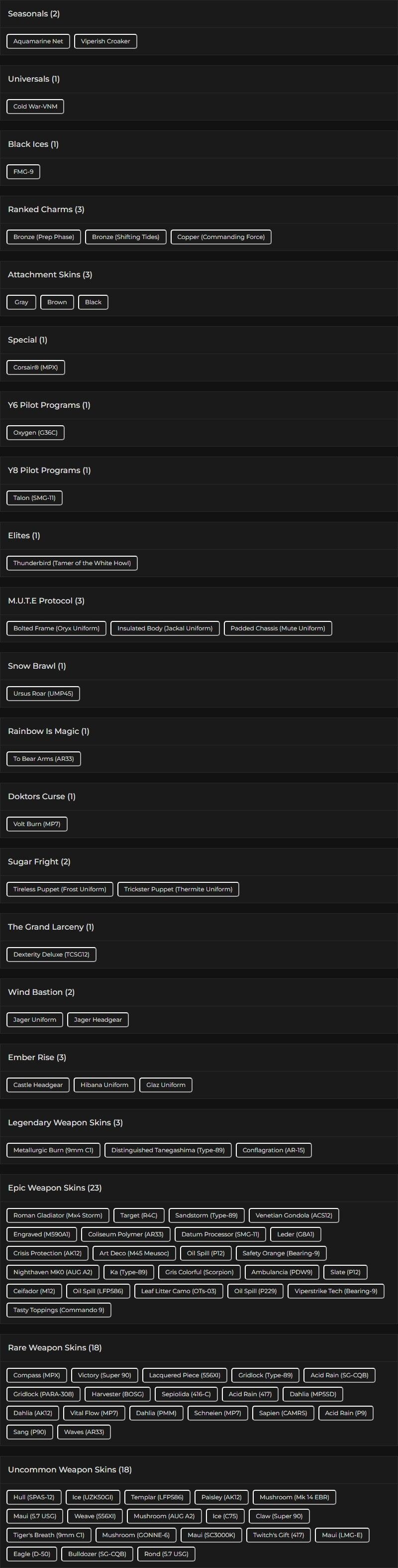 You can see all the skins and every detail from here r6skins.locker/profile/44431e05-8430-478e-9325-6a52c51fe1f3