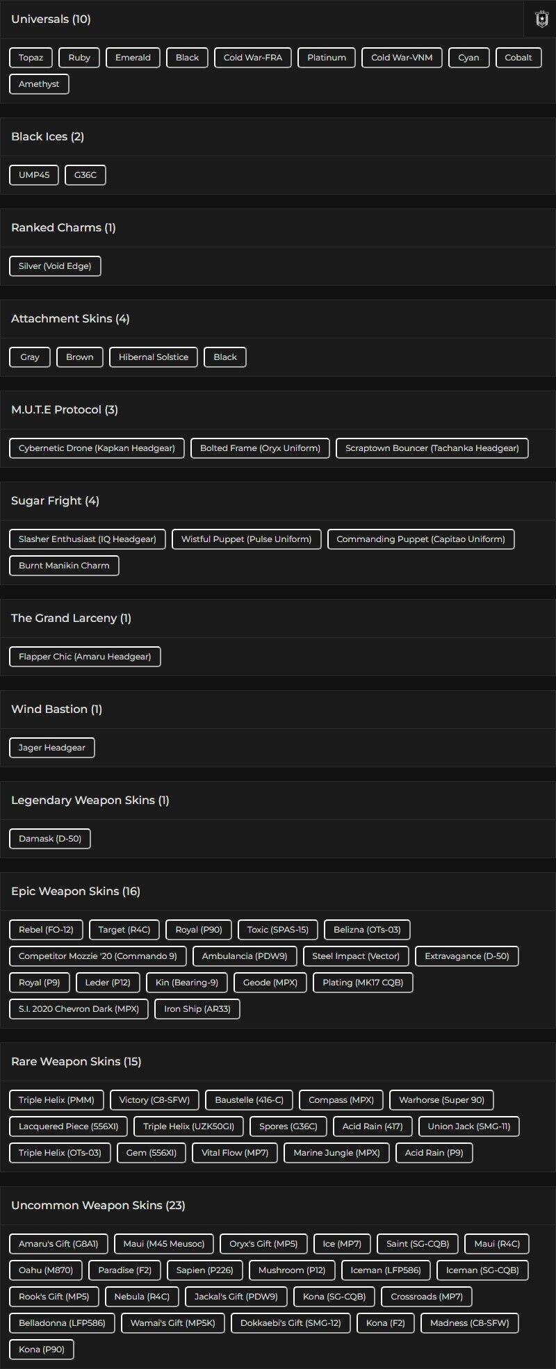 You can see all the skins and every detail from here r6skins.locker/profile/4fee55cf-54a6-4b15-97ff-10c0c0b39733