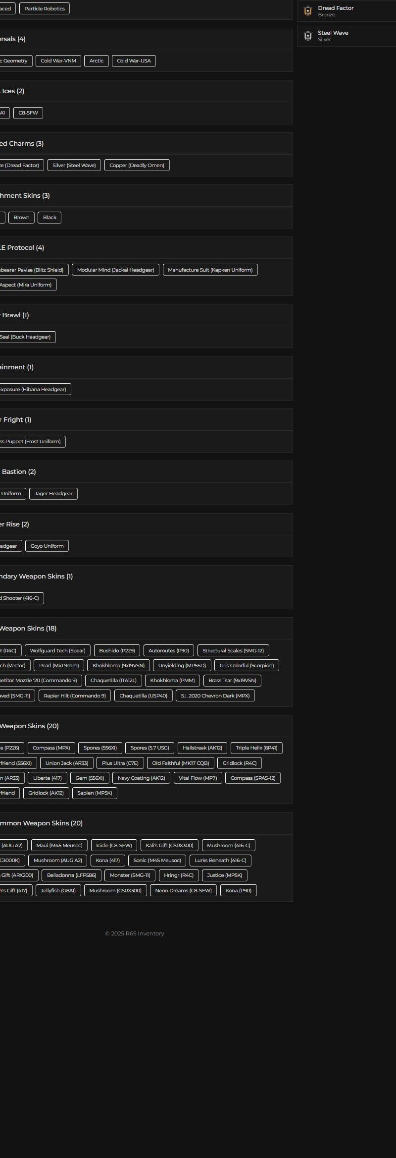 You can see all the skins and every detail from here r6skins.locker/profile/5f3ac9e2-777f-4bfa-9c67-c8e4f0393390