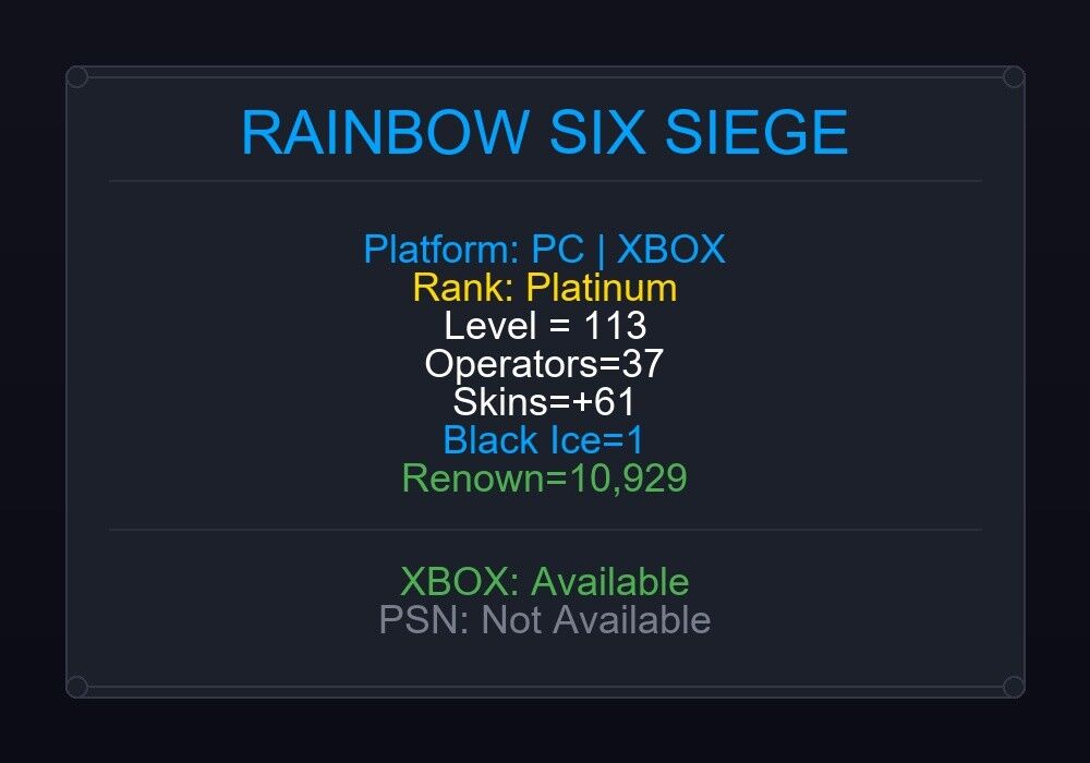 After purchase, you will receive full Details. After placing an order you will have access to your Ubisoft Email and Password. We will also give you email access. Full access to Ubisoft/Uplay and Email. You can change this information. If the account level is above 50+, you can play Rainbow Six Siege Ranked Ready matches. You can see all the skins and every detail from here r6skins.locker/profile/3fb10f20-8207-4891-876c-9d808a0036f1. Platform: PC|XBOX Level: 113 Operators Count: 37 Skins Count: +61 Top Ranks: Platinum: Grim Sky Gold: Shadow Legacy, Steel Wave 1x Black Ice: SMG-11 1x Universal: Plasma Pink 4x Epic Weapon Skins: Nighthaven MK0 (PDW9), Summer Bloom (AUG A2) … 1x Legendary Weapon Skins: Yorick (R4C) — If you want to play on pc, game is not purchased via ubisoft connect or fresh steam you are required to buy the game! NOTE: This account may include phone number verified but it may not be too so that means you may need a phone number. Never contact ubisoft after purchasing the account. It’s a Global Account and can be played from any part of this world (Region free). Please read the instructions carefully. We will not refund if you change your mind, are careless or make a mistake. Refunds will only be made if there is a technical glitch in the account. If you have any problems, you can reach us 24/7 via chat. Our customer support team will get back to you as soon as possible. Thank you very much for choosing us.