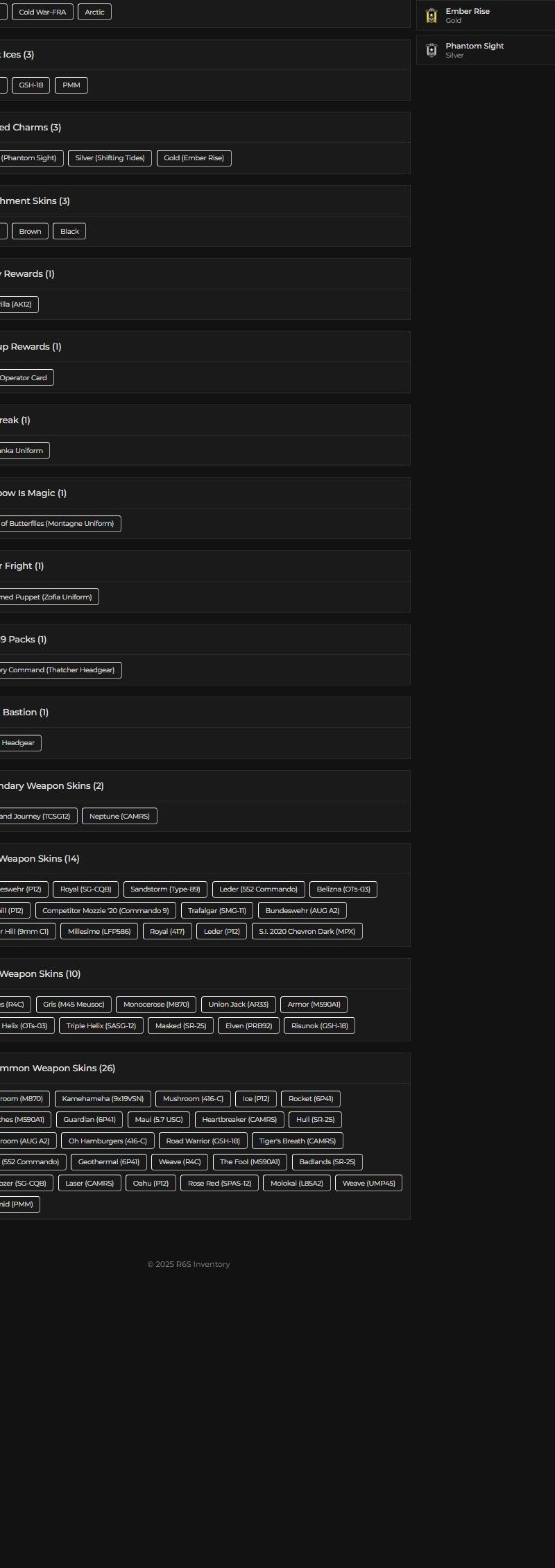 You can see all the skins and every detail from here r6skins.locker/profile/ee590c91-b02e-4769-a025-a0e2394711fc