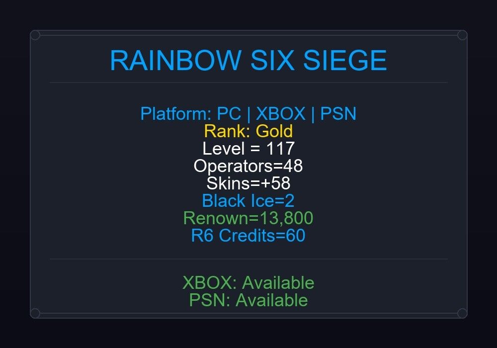 If the account level is above 50+, you can play Rainbow Six Siege Ranked Ready matches. You can see all the skins and every detail from here r6skins.locker/profile/d36c7412-4309-4a99-89a1-b84ff43860d7