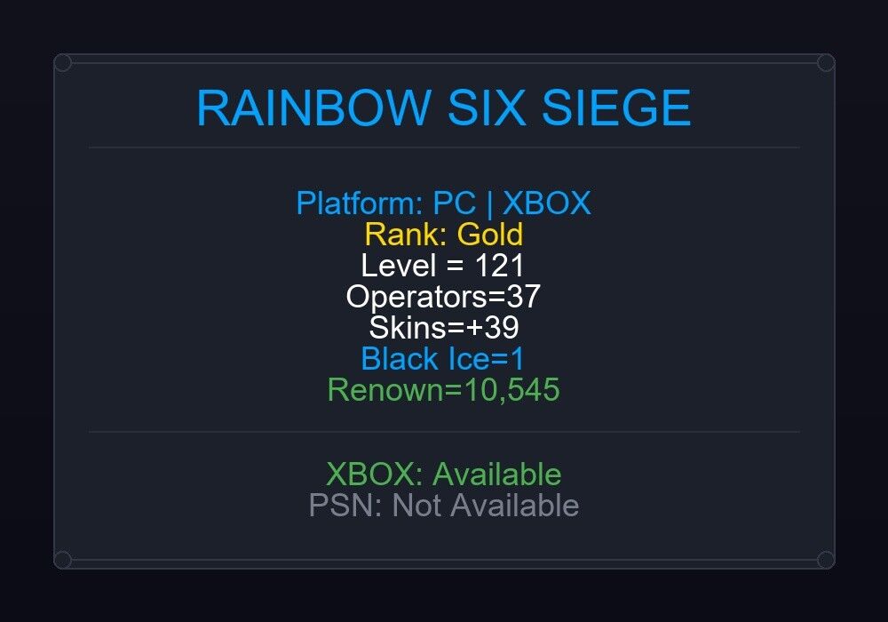 After purchase, you will receive full Details. After placing an order you will have access to your Ubisoft Email and Password. We will also give you email access. Full access to Ubisoft/Uplay and Email. You can change this information. If the account level is above 50+, you can play Rainbow Six Siege Ranked Ready matches. You can see all the skins and every detail from here r6skins.locker/profile/0cdf1f32-e1c0-4685-9981-3f2d42097fdd.