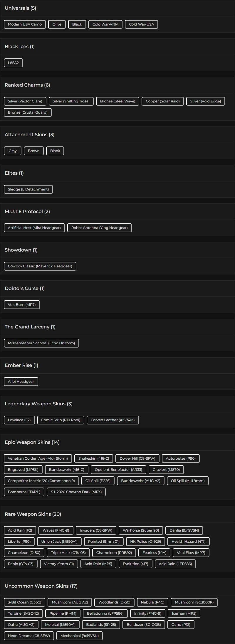 You can see all the skins and every detail from here r6skins.locker/profile/0ca76e6f-8f20-4408-94c9-50dea4d673b1