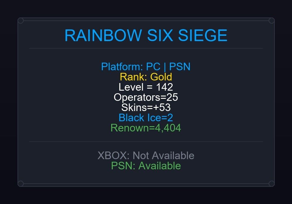 After purchase, you will receive full Details. After placing an order you will have access to your Ubisoft Email and Password. We will also give you email access. Full access to Ubisoft/Uplay and Email. You can change this information. If the account level is above 50+, you can play Rainbow Six Siege Ranked Ready matches. You can see all the skins and every detail from here r6skins.locker/profile/bce7266d-f183-4917-92e4-ae5b614f89c9. Platform: PC|PSN Level: 142 Operators Count: 25 Skins Count: +53 Top Ranks: Gold: Red Crow, Velvet Shell Silver: Dust Line 2x Black Ice: C8-SFW, P90 3x Universal: Haze, Black, Elephant 11x Epic Weapon Skins: Bundeswehr (MP7), Requin (F2) … If you want to play on pc, game is not purchased via ubisoft connect or fresh steam you are required to buy the game! NOTE: This account may include phone number verified but it may not be too so that means you may need a phone number. Never contact ubisoft after purchasing the account. It’s a Global Account and can be played from any part of this world (Region free). Please read the instructions carefully. We will not refund if you change your mind, are careless or make a mistake. Refunds will only be made if there is a technical glitch in the account. If you have any problems, you can reach us 24/7 via chat. Our customer support team will get back to you as soon as possible. Thank you very much for choosing us.