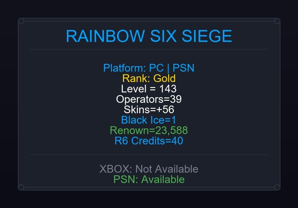 If the account level is above 50+, you can play Rainbow Six Siege Ranked Ready matches. You can see all the skins and every detail from here r6skins.locker/profile/9bec7e4a-b9e0-4be3-9d8d-58c5cd71f61d