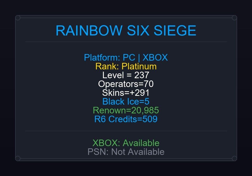 If the account level is above 50+, you can play Rainbow Six Siege Ranked Ready matches. You can see all the skins and every detail from here r6skins.locker/profile/98b1a12d-0df7-4b34-a3e0-503e4bf0f418