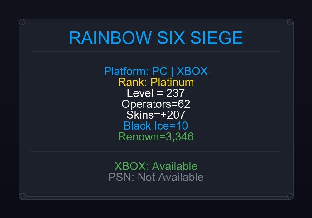 After purchase, you will receive full Details. After placing an order you will have access to your Ubisoft Email and Password. We will also give you email access. Full access to Ubisoft/Uplay and Email. You can change this information. If the account level is above 50+, you can play Rainbow Six Siege Ranked Ready matches. You can see all the skins and every detail from here r6skins.locker/profile/a9ab89e2-eec5-465e-ad76-ca6cfa9fe53f. Platform: PC|XBOX Level: 237 Operators Count: 62 Skins Count: +207 Top Ranks: Platinum: Demon Veil, Grim Sky, Phantom Sight 10x Black Ice: P226, 556XI, OTs-03, UMP45, 9x19VSN … 6x Universal: Crimson, Plasma Pink, Firefly, Gray, Elephant … 1x Seasonal: Enamored 1x Elite: Ash (Sidewinder) 33x Epic Weapon Skins: Mission Blacksmith (556XI), Nighthaven MK0 (P90) … 5x Legendary Weapon Skins: Hot Chopper (556XI), Steam Wagon (T-5 SMG) … If you want to play on pc, game is not purchased via ubisoft connect or fresh steam you are required to buy the game! NOTE: This account may include phone number verified but it may not be too so that means you may need a phone number. Never contact ubisoft after purchasing the account. It’s a Global Account and can be played from any part of this world (Region free). Please read the instructions carefully. We will not refund if you change your mind, are careless or make a mistake. Refunds will only be made if there is a technical glitch in the account. If you have any problems, you can reach us 24/7 via chat. Our customer support team will get back to you as soon as possible. Thank you very much for choosing us.
