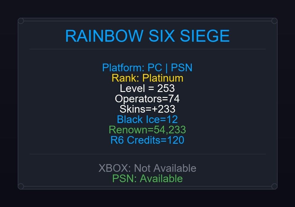 After purchase, you will receive full Details. After placing an order you will have access to your Ubisoft Email and Password. We will also give you email access. Full access to Ubisoft/Uplay and Email. You can change this information. If the account level is above 50+, you can play Rainbow Six Siege Ranked Ready matches. You can see all the skins and every detail from here r6skins.locker/profile/945c3432-0285-43bd-bc89-eb90c5aed403. Platform: PC|PSN Level: 253 Operators Count: 74 Skins Count: +233 Top Ranks: Platinum: Dread Factor Gold: Deep Freeze, Shadow Legacy 12x Black Ice: P226, OTs-03, P10 Roni, Mk1 9mm, MK17 CQB … 10x Universal: Jungle, Olive, USA Desert Camo, Cold War-FRA, Arctic … 4x Seasonal: Sombrero Vueltiao, Sonic Ripples, Aquamarine Net, Viperish Croaker 40x Epic Weapon Skins: Verkh (9x19VSN), Target (R4C) … 13x Legendary Weapon Skins: Berber Ornaments (AK-74M), Amber Tech (F2) … If you want to play on pc, game is not purchased via ubisoft connect or fresh steam you are required to buy the game! NOTE: This account may include phone number verified but it may not be too so that means you may need a phone number. Never contact ubisoft after purchasing the account. It’s a Global Account and can be played from any part of this world (Region free). Please read the instructions carefully. We will not refund if you change your mind, are careless or make a mistake. Refunds will only be made if there is a technical glitch in the account. If you have any problems, you can reach us 24/7 via chat. Our customer support team will get back to you as soon as possible. Thank you very much for choosing us.