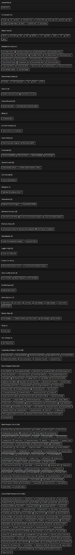 You can see all the skins and every detail from here r6skins.locker/profile/084ae5a2-d22d-48fa-97ef-2fdfc11ec0e8
