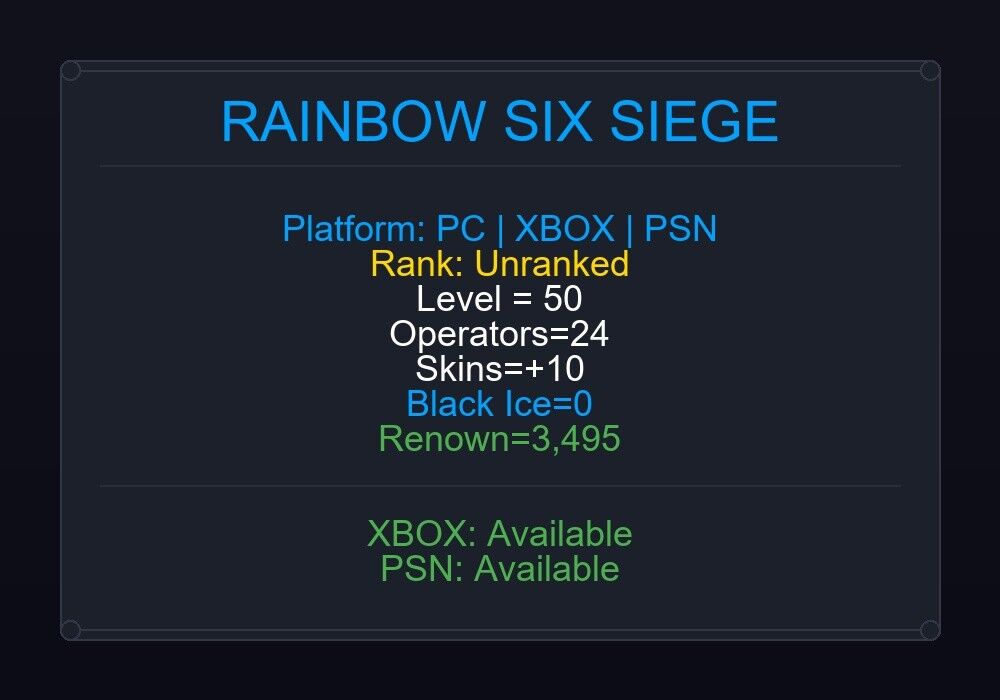 After purchase, you will receive full Details. After placing an order you will have access to your Ubisoft Email and Password. We will also give you email access. Full access to Ubisoft/Uplay and Email. You can change this information. If the account level is above 50+, you can play Rainbow Six Siege Ranked Ready matches. You can see all the skins and every detail from here r6skins.locker/profile/b703e4df-acf5-4cd2-86b8-4b836f941d6e. Platform: Uplay|PSN|XBOX Level: 50 Operators Count: 24 Skins Count: +10. If you have any problems, you can reach us 24/7 via chat. Our customer support team will get back to you as soon as possible. Thank you very much for choosing us.