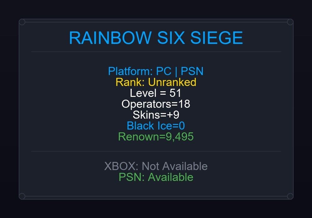 If the account level is above 50+, you can play Rainbow Six Siege Ranked Ready matches. You can see all the skins and every detail from here r6skins.locker/profile/a43ec218-abd2-42fd-a478-9b778bf67e94