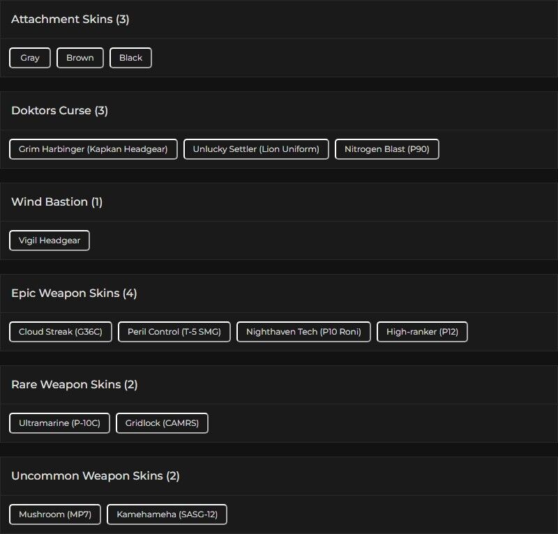 Cloud Streak (G36C), Peril Control (T-5 SMG)…