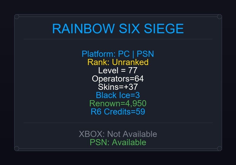 If the account level is above 50+, you can play Rainbow Six Siege Ranked Ready matches. You can see all the skins and every detail from here r6skins.locker/profile/349caa8d-7354-47ec-9076-f32ab678911e.