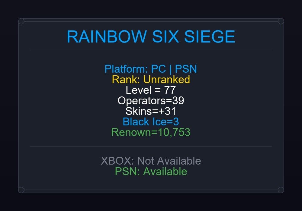 If the account level is above 50+, you can play Rainbow Six Siege Ranked Ready matches. You can see all the skins and every detail from here r6skins.locker/profile/408a3ec9-66e7-48fc-b2c3-2179b9ba074e