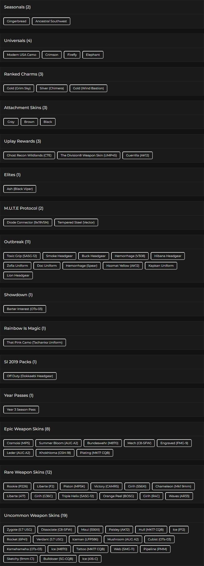 You can see all the skins and every detail from here r6skins.locker/profile/ce5e457d-2b1a-4658-92c7-0c24e676e83a