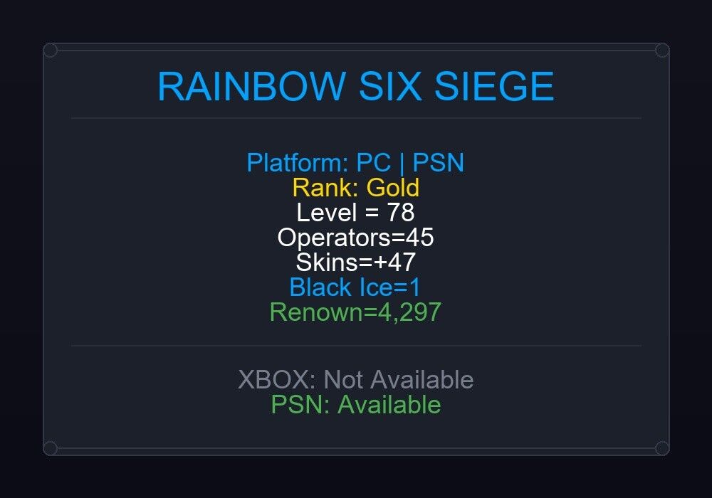 After purchase, you will receive full Details. After placing an order you will have access to your Ubisoft Email and Password. We will also give you email access. Full access to Ubisoft/Uplay and Email. You can change this information. If the account level is above 50+, you can play Rainbow Six Siege Ranked Ready matches. You can see all the skins and every detail from here r6skins.locker/profile/916f663d-bf60-45e0-a68a-f1133f955430. Platform: Uplay|PSN Level: 78 Operators Count: 45 Skins Count: +47 Top Ranks: Gold: Wind Bastion 1x Black Ice: 6P41 1x Universal: Elephant 1x Seasonal: Sombrero Vueltiao 1x Elite: Ash (Sidewinder) 2x Epic Weapon Skins: Bundeswehr (416-C), Slate (P12) If you want to play on pc, game is not purchased via ubisoft connect or fresh steam you are required to buy the game! NOTE: This account may include phone number verified but it may not be too so that means you may need a phone number. Never contact ubisoft after purchasing the account. It’s a Global Account and can be played from any part of this world (Region free). Please read the instructions carefully. We will not refund if you change your mind, are careless or make a mistake. Refunds will only be made if there is a technical glitch in the account. If you have any problems, you can reach us 24/7 via chat. Our customer support team will get back to you as soon as possible. Thank you very much for choosing us.