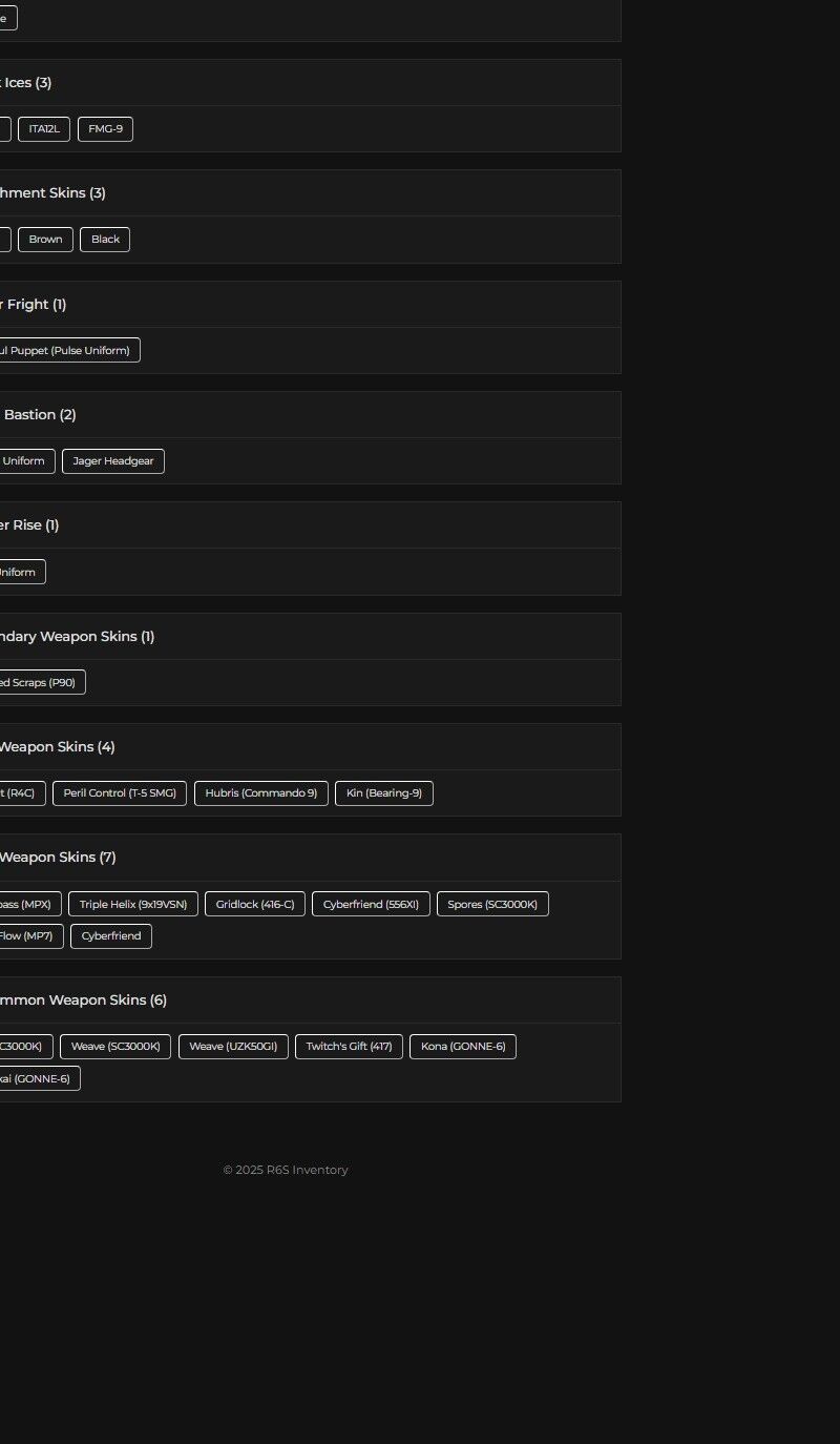 You can see all the skins and every detail from here r6skins.locker/profile/ed32e905-66d9-4f9d-bf67-9a76b3d69acc