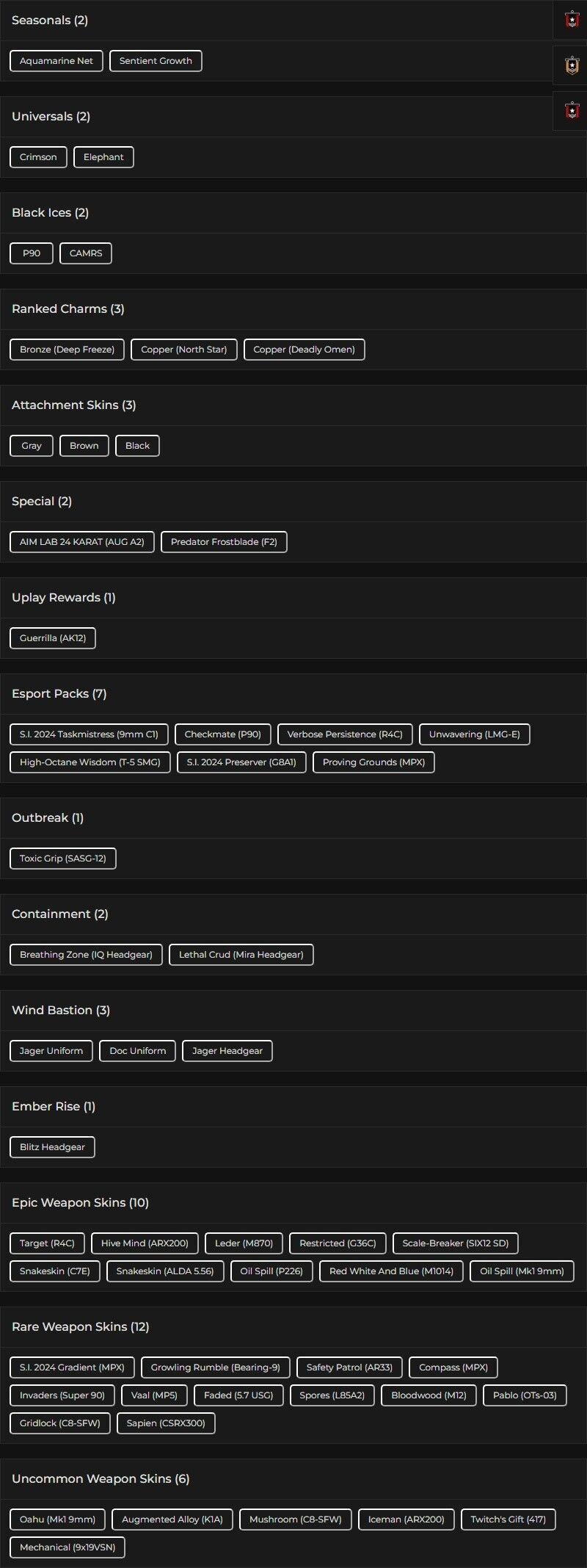 You can see all the skins and every detail from here r6skins.locker/profile/8a8eff62-9d5b-475b-94bb-e13abf5947b3