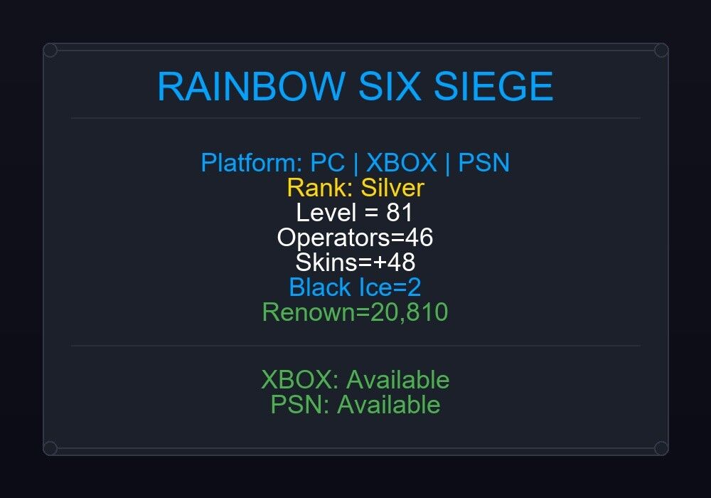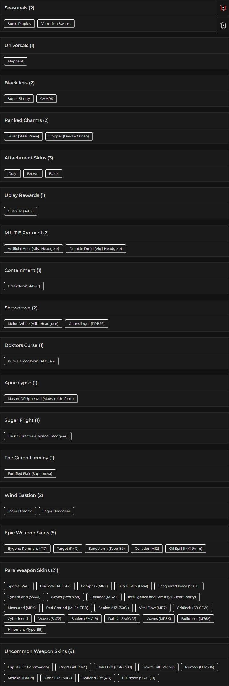 You can see all the skins and every detail from here r6skins.locker/profile/9e4774ad-787b-4279-9c2f-a6e41564feb6