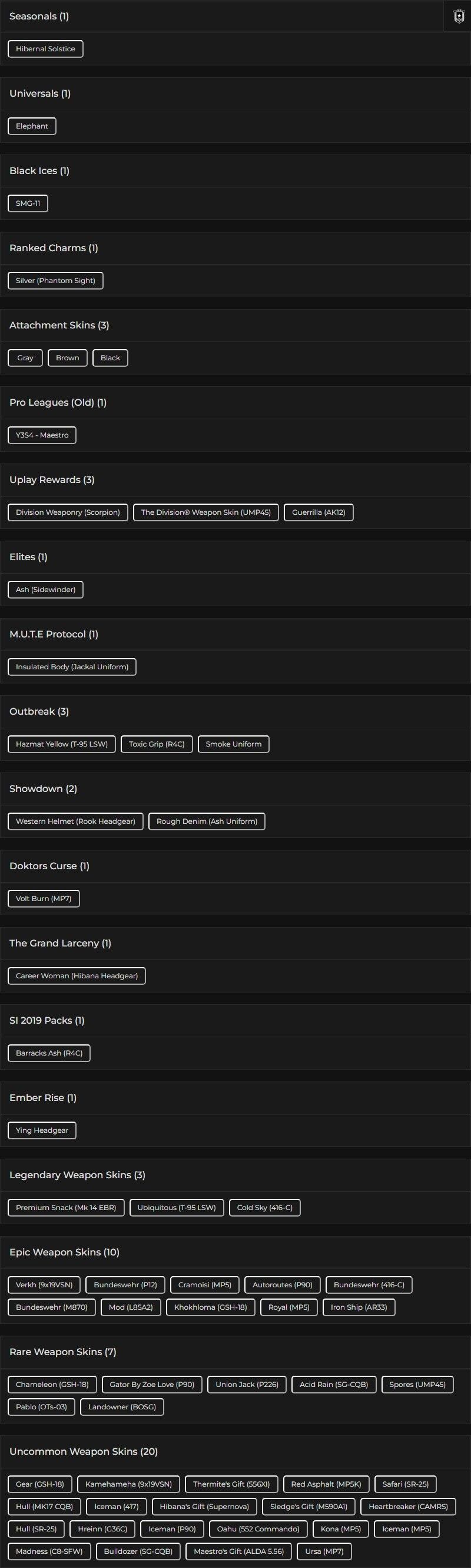 You can see all the skins and every detail from here r6skins.locker/profile/65f076a5-3a2e-4833-af05-db4e509cbff5