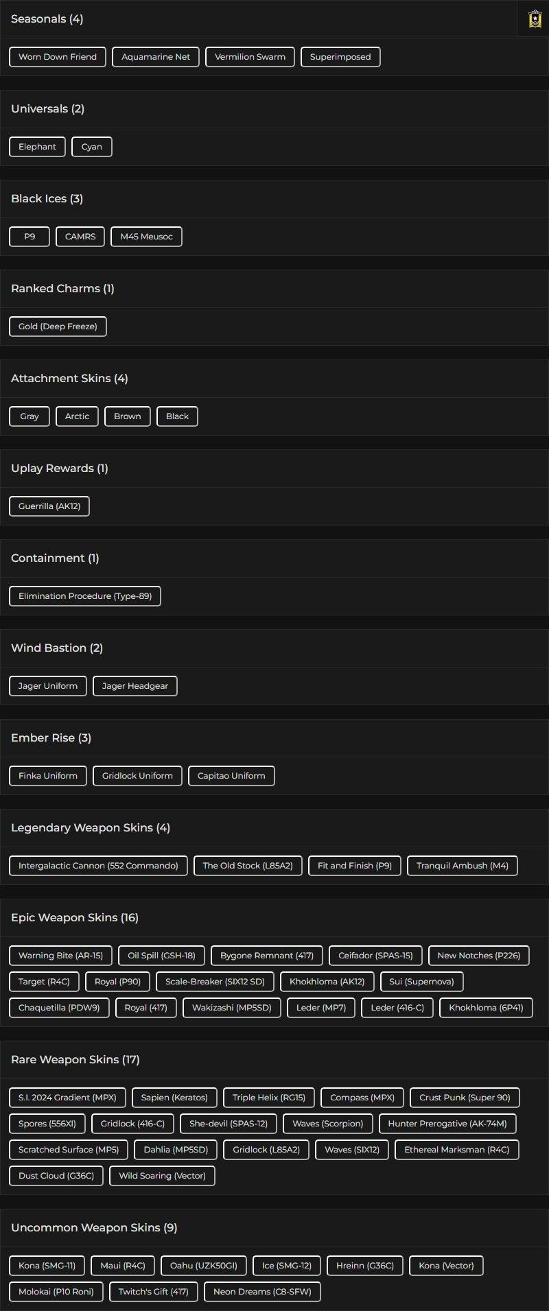You can see all the skins and every detail from here r6skins.locker/profile/bec84977-f4ea-422e-aa9b-006f2bc779b4