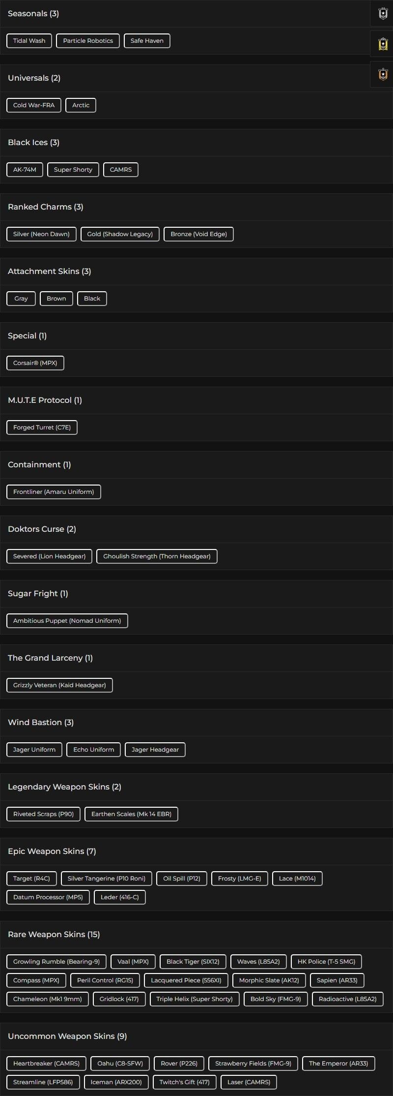 You can see all the skins and every detail from here r6skins.locker/profile/6ecc7615-ace6-4c2d-8b3d-48cd919948d1
