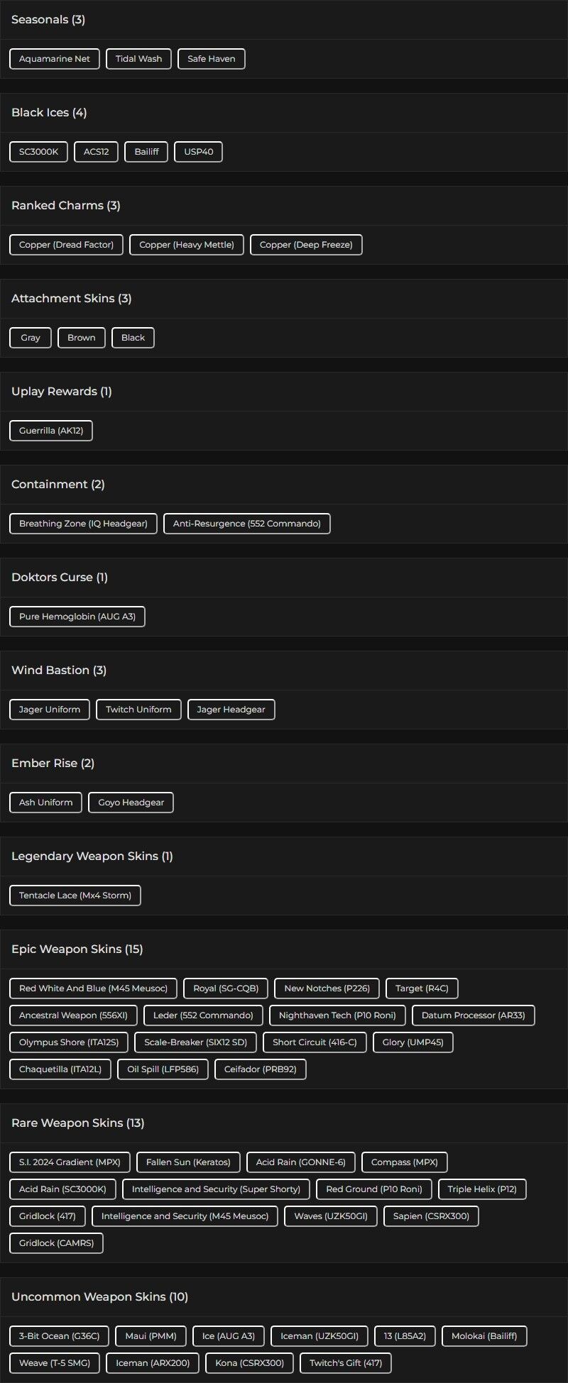 You can see all the skins and every detail from here r6skins.locker/profile/852f9314-e6cc-4e46-9ca4-d821578af030
