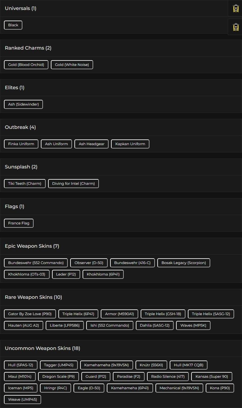 You can see all the skins and every detail from here r6skins.locker/profile/85e8d2c6-986a-4e78-ab7b-518ac7c32045