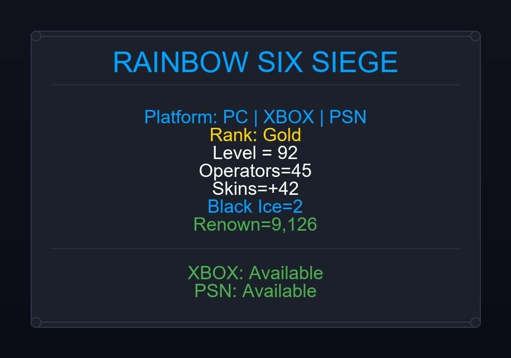 If the account level is above 50+, you can play Rainbow Six Siege Ranked Ready matches. You can see all the skins and every detail from here r6skins.locker/profile/d30fcc34-0b46-4f71-a4b3-8fa2f83e6204