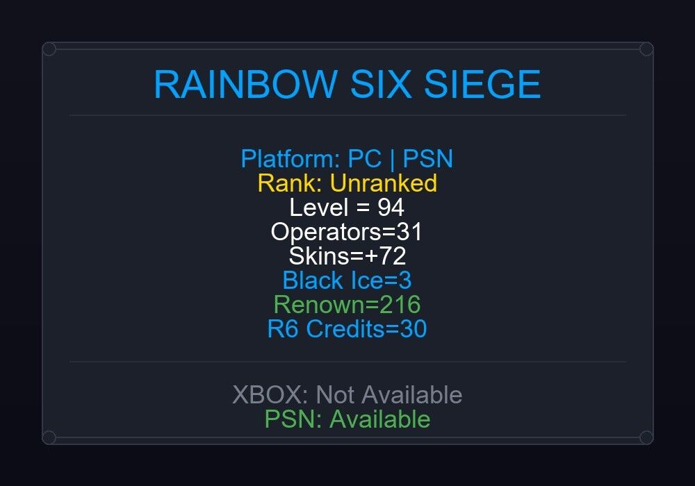 After purchase, you will receive full Details. After placing an order you will have access to your Ubisoft Email and Password. We will also give you email access. Full access to Ubisoft/Uplay and Email. You can change this information. If the account level is above 50+, you can play Rainbow Six Siege Ranked Ready matches. You can see all the skins and every detail from here r6skins.locker/profile/2d374587-a04a-46d9-bbd3-ed949fcbe76d. Platform: PC|PSN Level: 94 Operators Count: 31 Skins Count: +72 3x Black Ice: SG-CQB, 416-C, 417 4x Universal: Jungle, Modern USA Camo, Elephant, Canary 1x Seasonal: Ectoplasm 9x Epic Weapon Skins: Bundeswehr (552 Commando), Engraved (AR33). NOTE: This account may include phone number verified but it may not be too so that means you may need a phone number. Never contact ubisoft after purchasing the account. It’s a Global Account and can be played from any part of this world (Region free). Please read the instructions carefully. We will not refund if you change your mind, are careless or make a mistake. Refunds will only be made if there is a technical glitch in the account. If you have any problems, you can reach us 24/7 via chat. Our customer support team will get back to you as soon as possible. Thank you very much for choosing us.