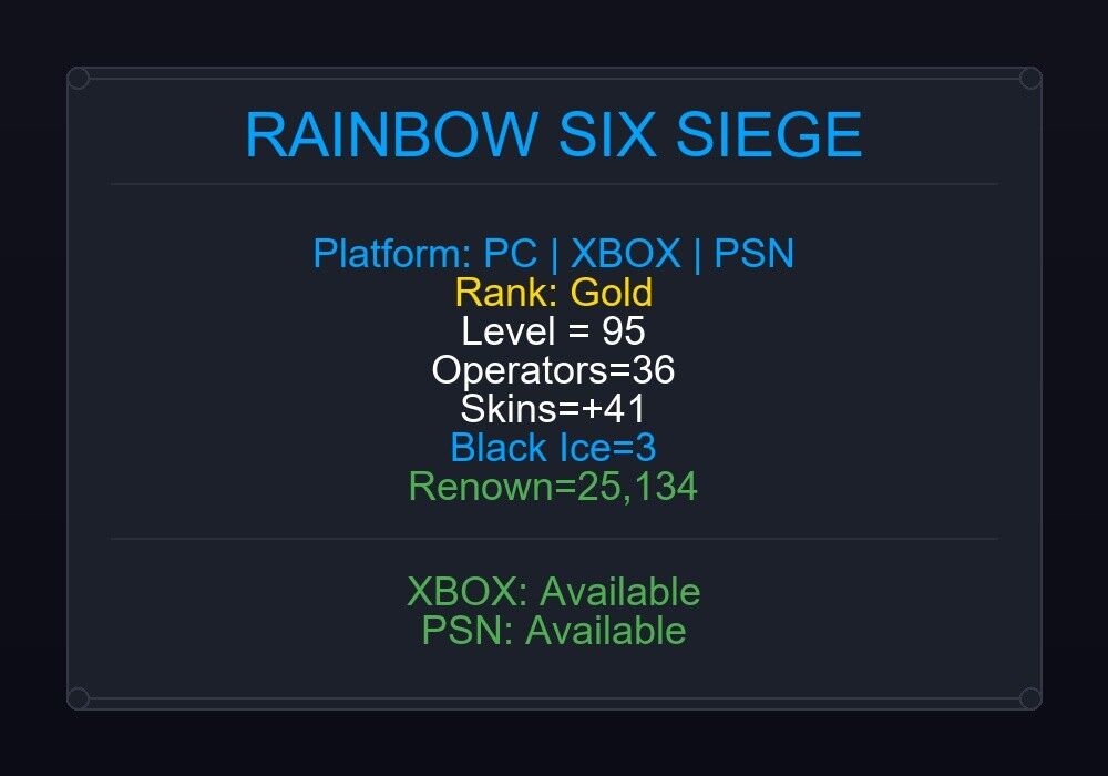 After purchase, you will receive full Details. After placing an order you will have access to your Ubisoft Email and Password. We will also give you email access. Full access to Ubisoft/Uplay and Email. You can change this information. If the account level is above 50+, you can play Rainbow Six Siege Ranked Ready matches. You can see all the skins and every detail from here r6skins.locker/profile/792df67b-b35f-49d9-b594-8d5467298c19. Platform: PC|PSN|XBOX Level: 95 Operators Count: 36 Skins Count: +41 Top Ranks: Gold: North Star Silver: Neon Dawn, Steel Wave 3x Black Ice: M870, P90, SASG-12 1x Universal: Cold War-GBR 7x Epic Weapon Skins: Verkh (9x19VSN), Target (R4C) … If you want to play on pc, game is not purchased via ubisoft connect or fresh steam you are required to buy the game! NOTE: This account may include phone number verified but it may not be too so that means you may need a phone number. Never contact ubisoft after purchasing the account. It’s a Global Account and can be played from any part of this world (Region free). Please read the instructions carefully. We will not refund if you change your mind, are careless or make a mistake. Refunds will only be made if there is a technical glitch in the account. If you have any problems, you can reach us 24/7 via chat. Our customer support team will get back to you as soon as possible. Thank you very much for choosing us.