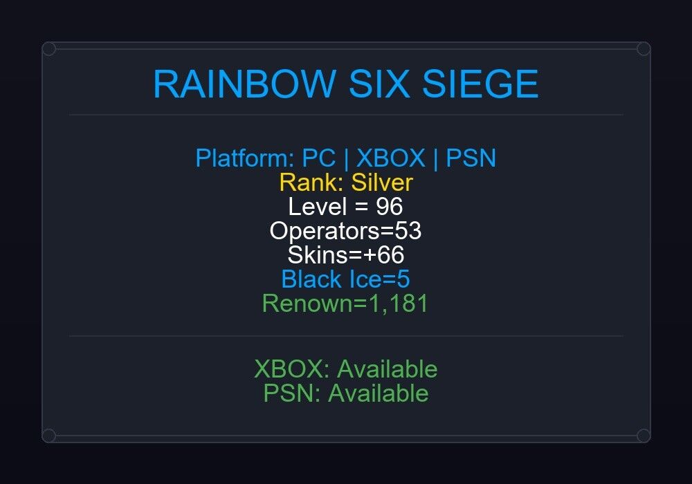 After purchase, you will receive full Details. After placing an order you will have access to your Ubisoft Email and Password. We will also give you email access. Full access to Ubisoft/Uplay and Email. You can change this information. If the account level is above 50+, you can play Rainbow Six Siege Ranked Ready matches. You can see all the skins and every detail from here r6skins.locker/profile/e8866bb9-bf3b-40ea-a795-64861c3c633e. Platform: Uplay|PSN|XBOX Level: 96 Operators Count: 53 Skins Count: +66 Top Ranks: Silver: Heavy Mettle 5x Black Ice: F2, T-95 LSW, M1014, P9, CAMRS 2x Universal: Cyan, Amethyst 2x Seasonal: Aquamarine Net, Viperish Croaker 19x Epic Weapon Skins: Verkh (9x19VSN), Red White And Blue (M45 Meusoc). NOTE: This account may include phone number verified but it may not be too so that means you may need a phone number. Never contact ubisoft after purchasing the account. It’s a Global Account and can be played from any part of this world (Region free). Please read the instructions carefully. We will not refund if you change your mind, are careless or make a mistake. Refunds will only be made if there is a technical glitch in the account. If you have any problems, you can reach us 24/7 via chat. Our customer support team will get back to you as soon as possible. Thank you very much for choosing us.