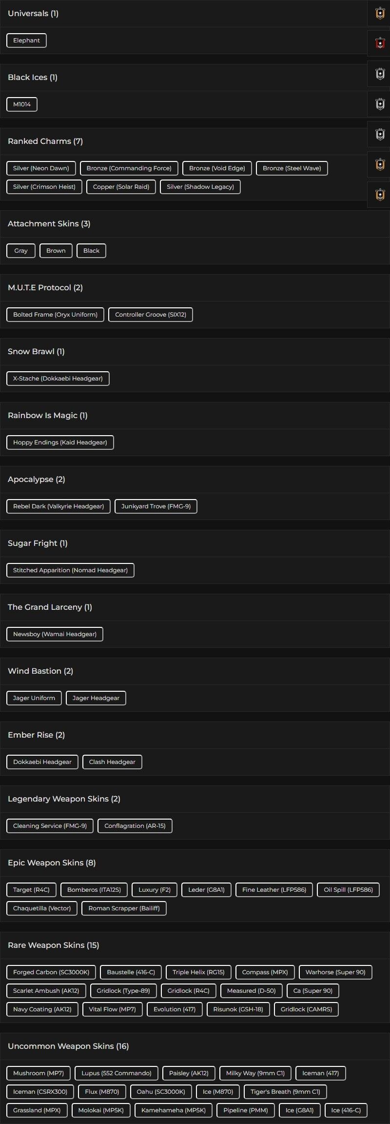 You can see all the skins and every detail from here r6skins.locker/profile/e7a6c899-9de3-4ebb-87da-7e49f2c63604