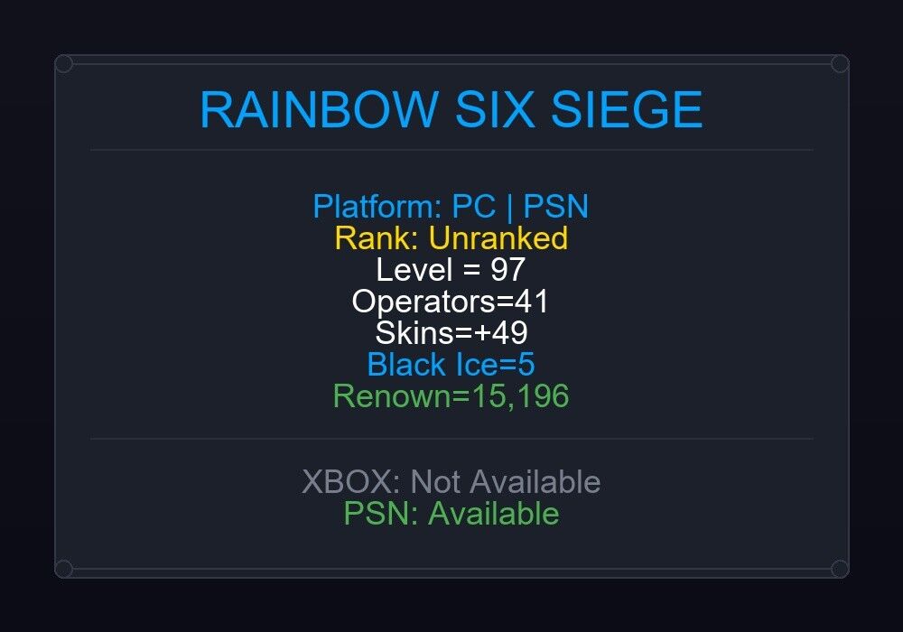 After purchase, you will receive full Details. After placing an order you will have access to your Ubisoft Email and Password. We will also give you email access. Full access to Ubisoft/Uplay and Email. You can change this information. If the account level is above 50+, you can play Rainbow Six Siege Ranked Ready matches. You can see all the skins and every detail from here r6skins.locker/profile/6878c9ef-c9dc-4ff7-9be4-e5ecfd86f003. Platform: Uplay|PSN Level: 97 Operators Count: 41 Skins Count: +49 5x Black Ice: C7E, SPAS-12, MP7, M249, 416-C 1x Universal: Olive 1x Seasonal: Viperish Croaker 14x Epic Weapon Skins: Southern Regiment (Super Shorty), Target (R4C).