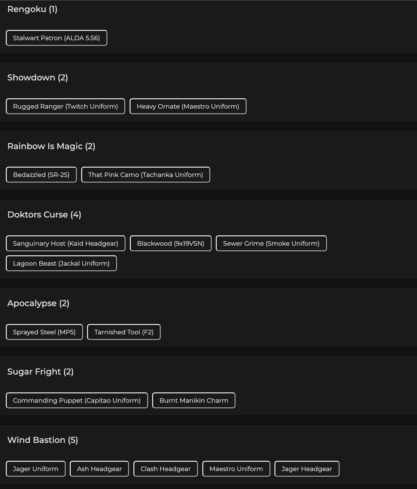 Attachment Skins (17): Signature Six 2021, Animality, Wisdom and Hospitality, Blue-Hued Camo, S.I. 2021 Orange Team, S.I. 2021 Blue Team, Gray, Bone Chills, First Class Burglary, Brown, S.I. 2021 Red Team, Tall Grass, Chroma Streaks, Thermal Antipodes, S.I. 2021 Green Team, Black, Trekking Miscellany