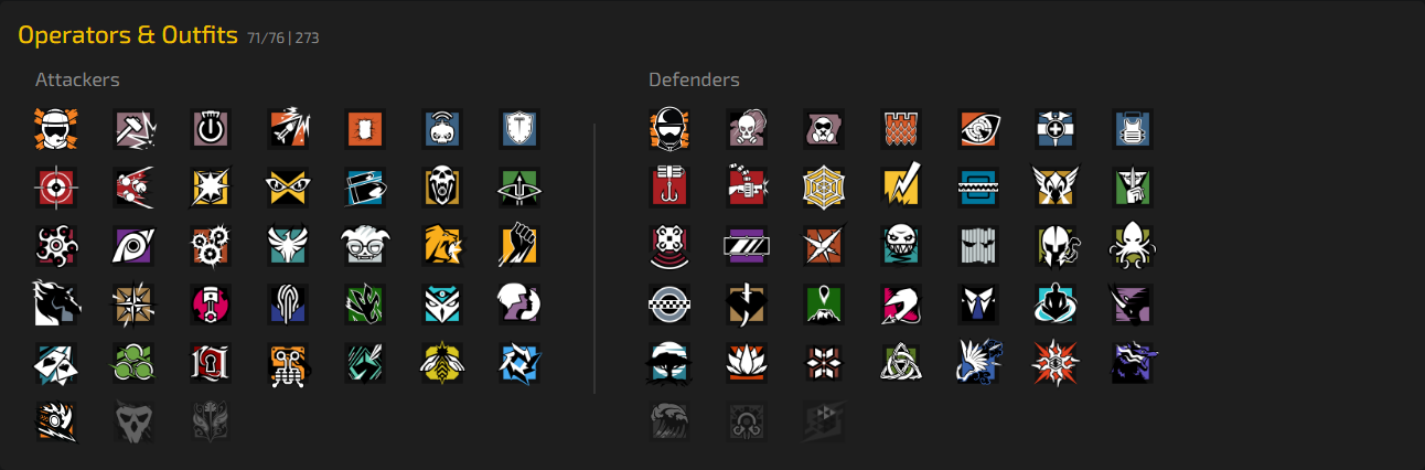 12x Pro Leagues (Old) (12): Y2S4 – Castle | Y3S3 – Vigil | Y4S1 – Nomad | Y4S1 – Nomad | Y5S2 – Bandit | Y5S2 – Bandit | Y5S2 – Mute | Y5S2 – Mute | Y5S2 – Sledge | Y5S2 – Sledge | Y5S2 – Thatcher | Y5S2 – Thatcher