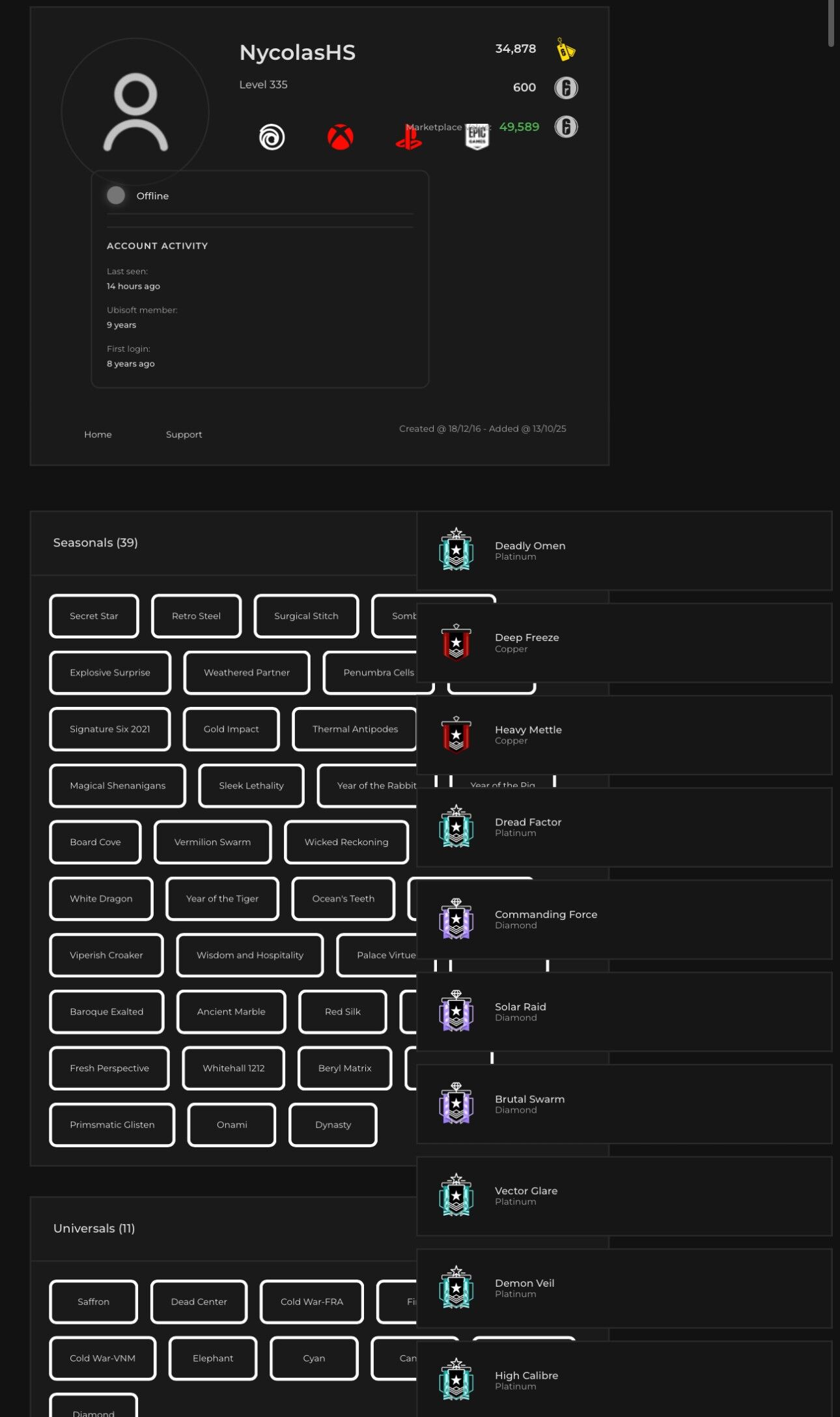 Home » Products » Siege Uplay 335 lvl|Universals: 11|Black Ices: 29|Dust Lines: 1|Racer: 1|Pro Leagues (Old): 3|Elites: 1|Onami|Diamond x3| 39 seasonal | and more rare stuff