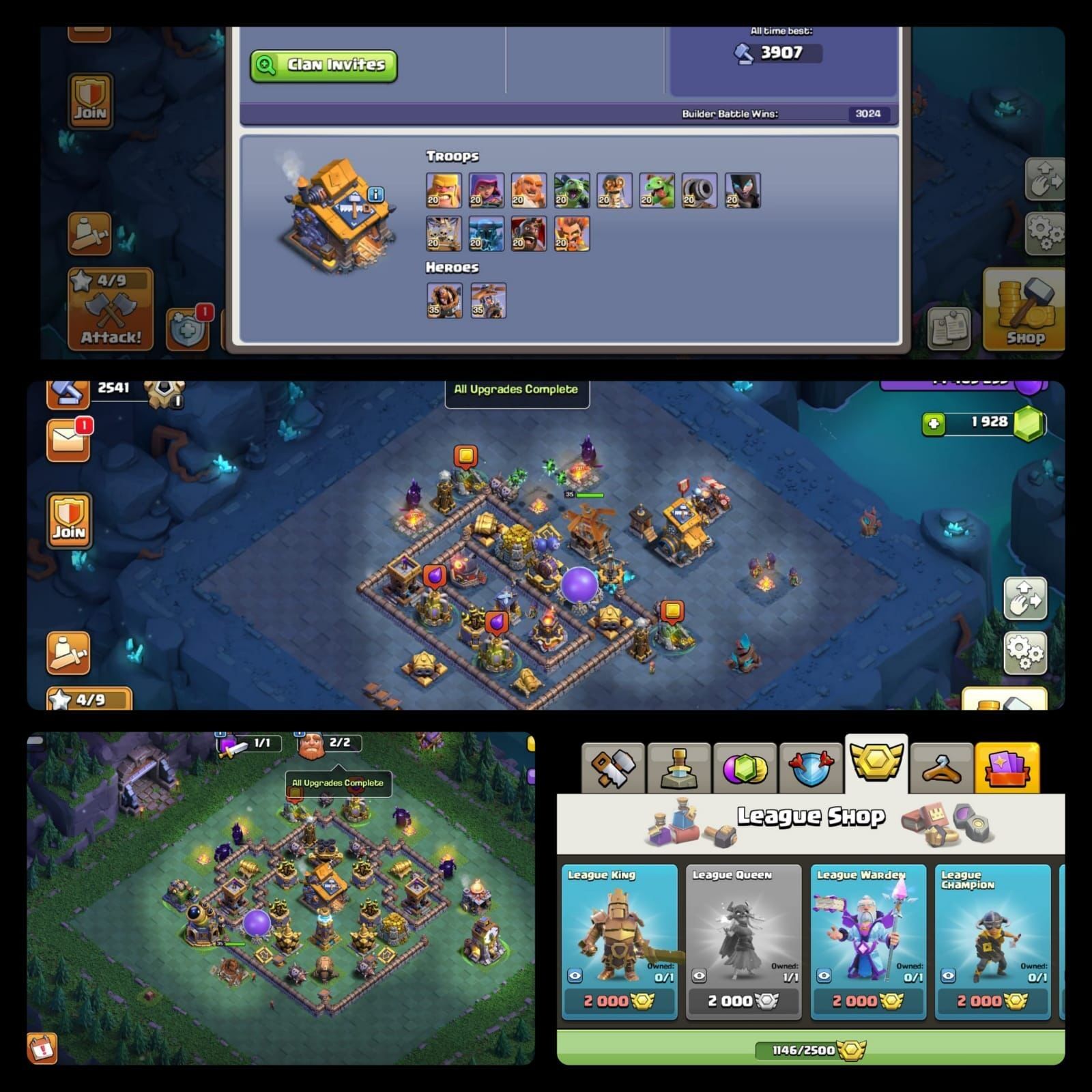 ⚡TANKED TH17 XP 237 || RARE LEAGUE QUEEN SKIN, 6 EPIC EQUIPMENTS 20+⚡FREE NAME CHANGE⚡BK100, AQ100, GW75, RC50, MP80⚡1146 CWL MEDALS, MAX BUILDER BASE AND 16 EQUIPMENTS⚡11 SKINS, 8 EPICS⚡GAUNTLET 27, ARROW 11, FIREBALL 27, ROCKET SPEAR 20, SPIKY BALL 23, MAGIC MIRROR 26, LAVALOON PUPPET 8, ELECTRO BOOST 20⚡5914 LEGEND ATB⚡